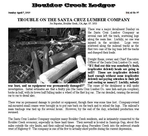 The following front page story appeared in the Boulder Creek Ledger on Sunday, April 7, 1933...
