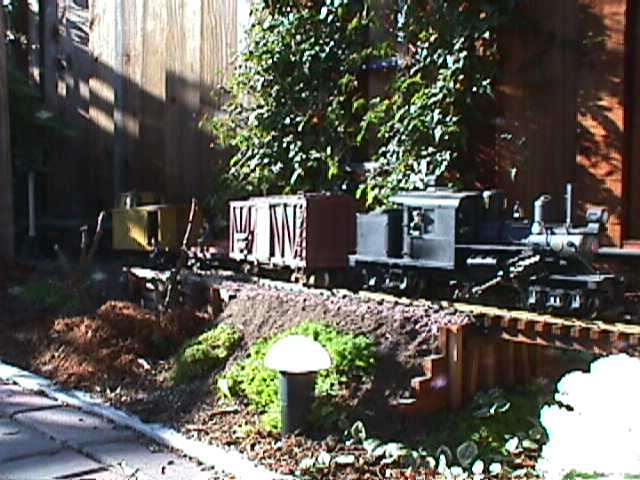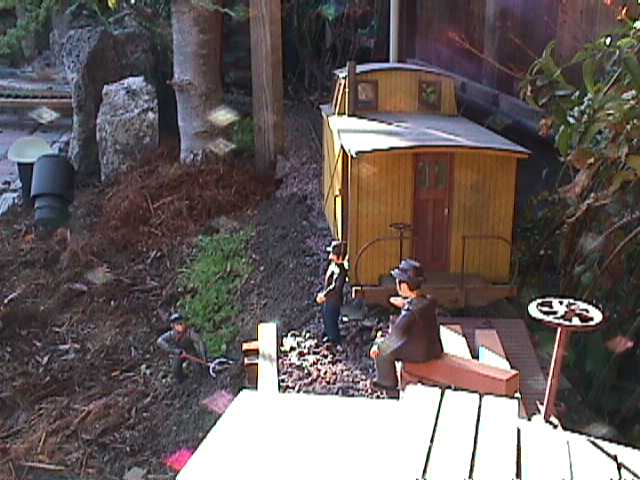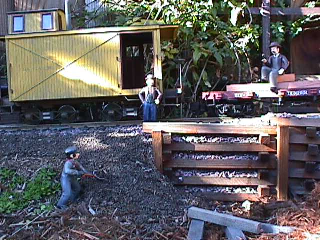 It's 73 degrees and sunny in the Bay Area today, so the Santa Cruz Lumber Co. took the opportunity to do some necessary track maintenance in preparation for the beginning of logging season in the spring. A train was taken out and stopped where problems were noted. Most consisted of minor erosion of the grading, so out came the shovels and repairs were made.